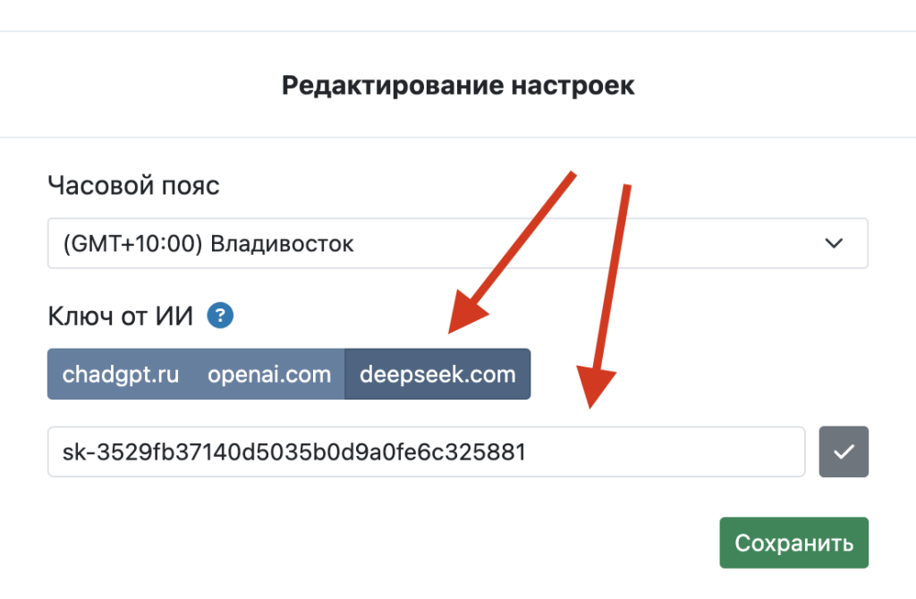 - Создать ключ в разделе https://platform.deepseek.com/api_keys