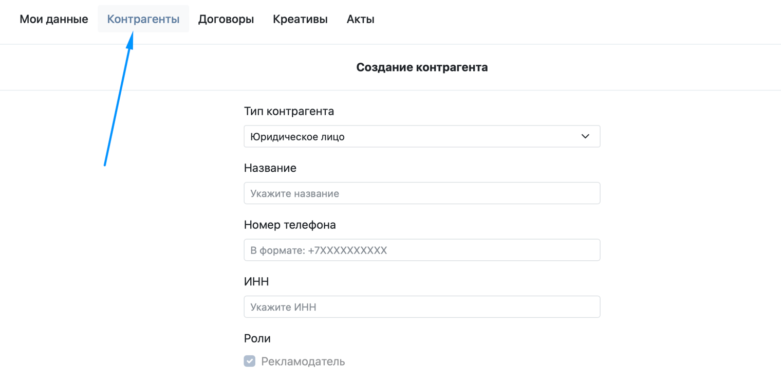 На странице контрагентов заполните данные о ваших рекламодателях.