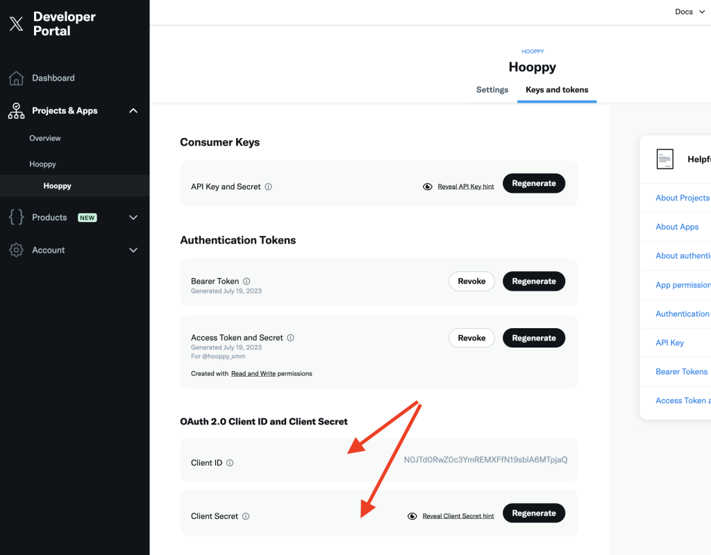 - В разделе Ключи и Токены скопируйте два ключа, как показано на скриншоте, и вставьте их в соответствующие поля на Хуппи: