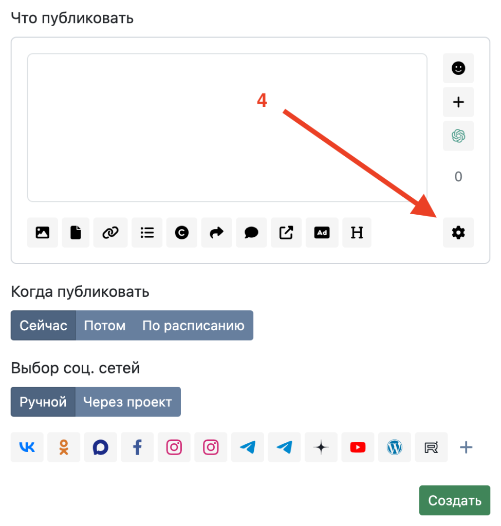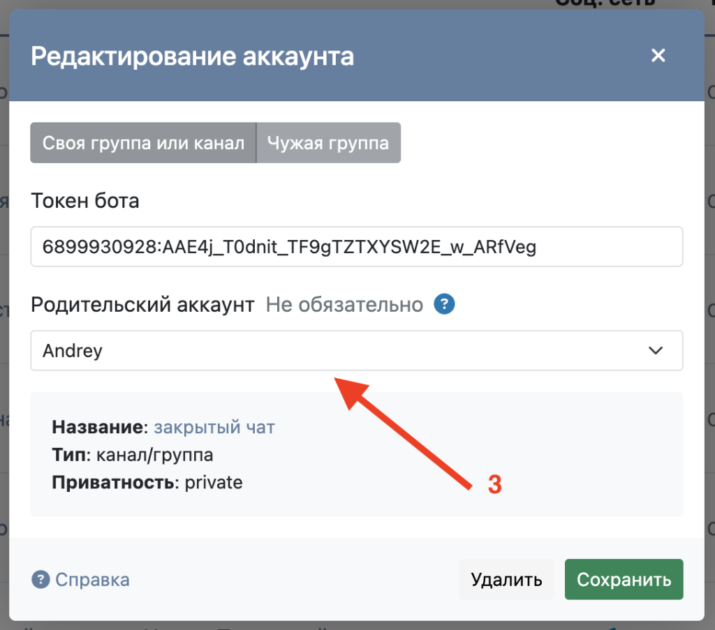 Для того, чтобы публиковать большие тексты вместе с фото и видео, нужно указать Родительский аккаунт ТГ для того канала, в котором вы хотите так делать. Для этого нужно: