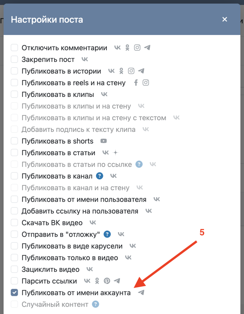 - При создании поста указать настройку Публиковать от имени аккаунта