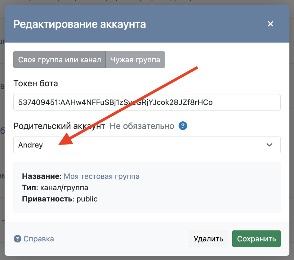 На следующей картинке показано, как указать родительский аккаунт для канала ТГ: