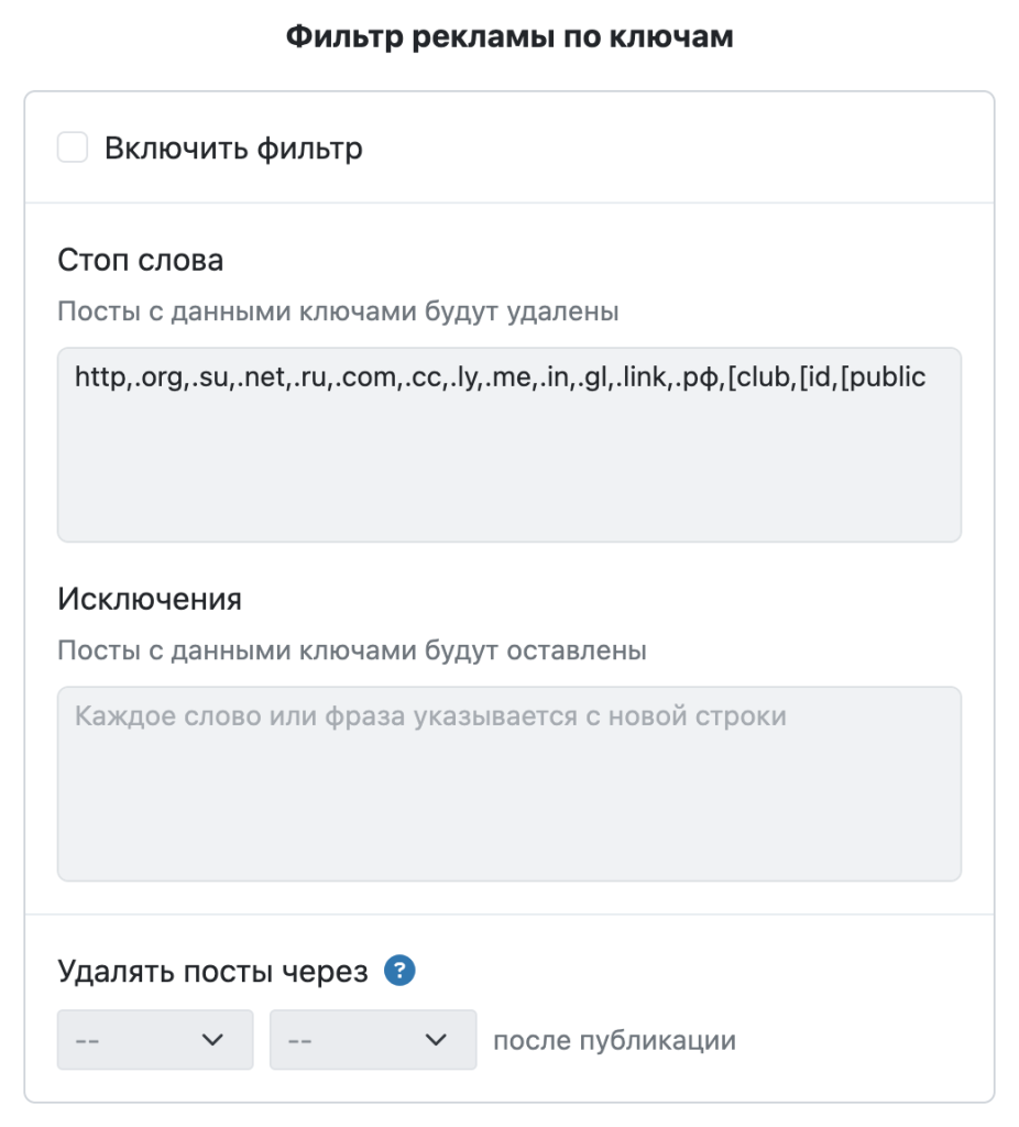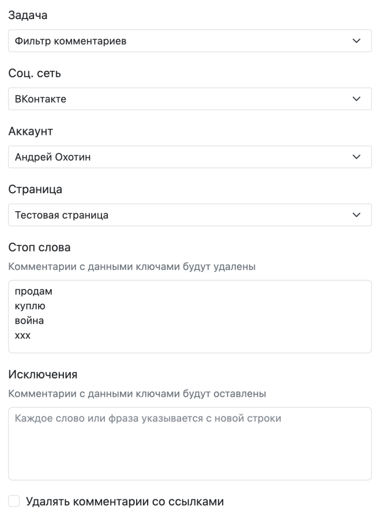 Данная функция позволяет отслеживать комментарии в ваших группах ВК, ОК или ТГ и удалять их, если в них встречаются определенные ключевые слова.
