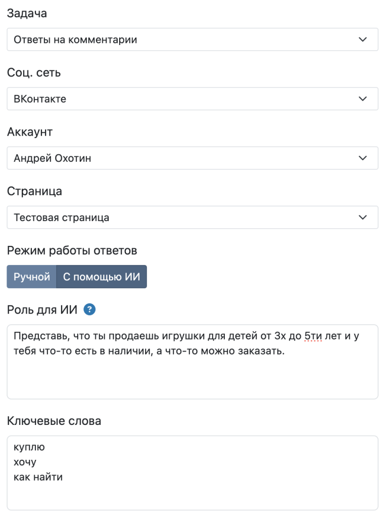 Ответы могут быть заданы вами, по конкретным ключевым словам и заданным текстом, либо на них может отвечать ИИ, так, как посчитает нужным, исходя из указанной для него роли.
