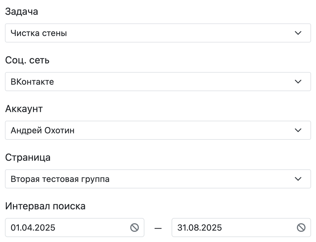Эта функция позволит удалить вообще все посты из группы ВКонтакте, по указанному интервалу времени.