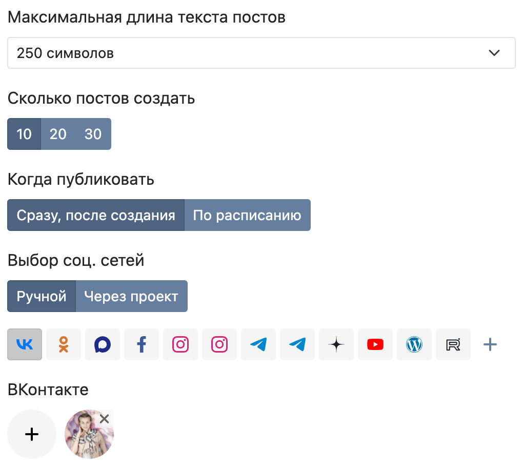 Затем можно указать максимальную длину текстов, число создаваемых постов и место, куда их нужно будет опубликовать: сразу или по определенному расписанию.